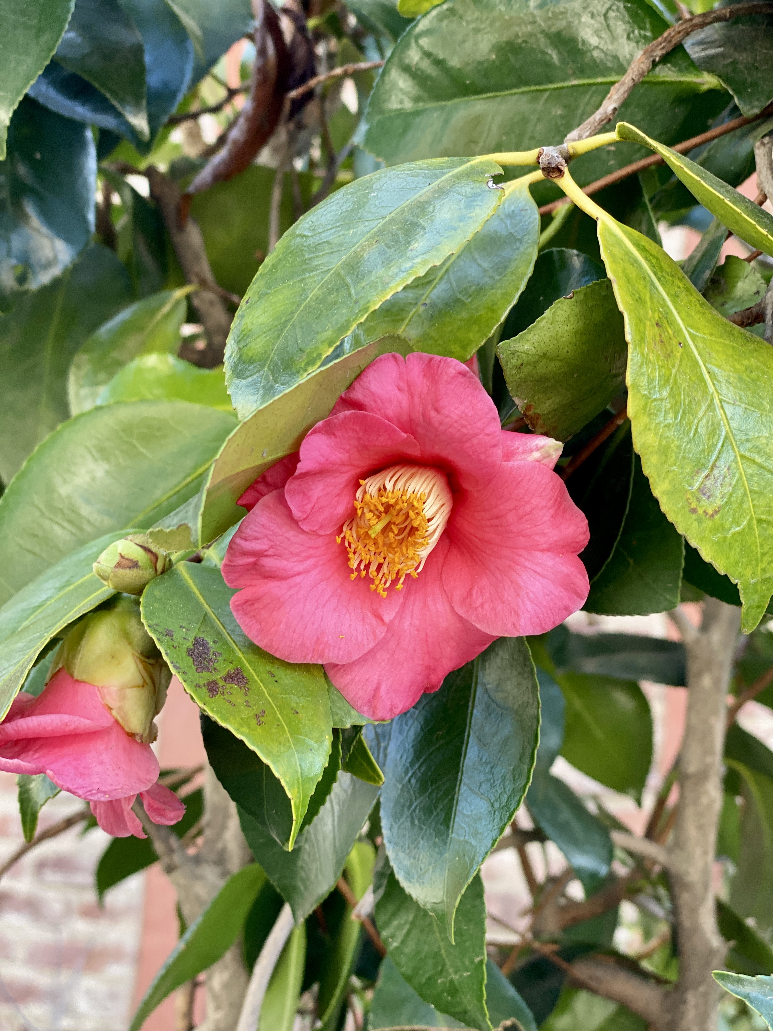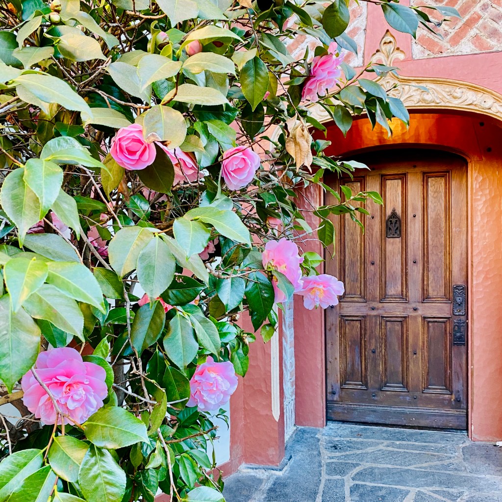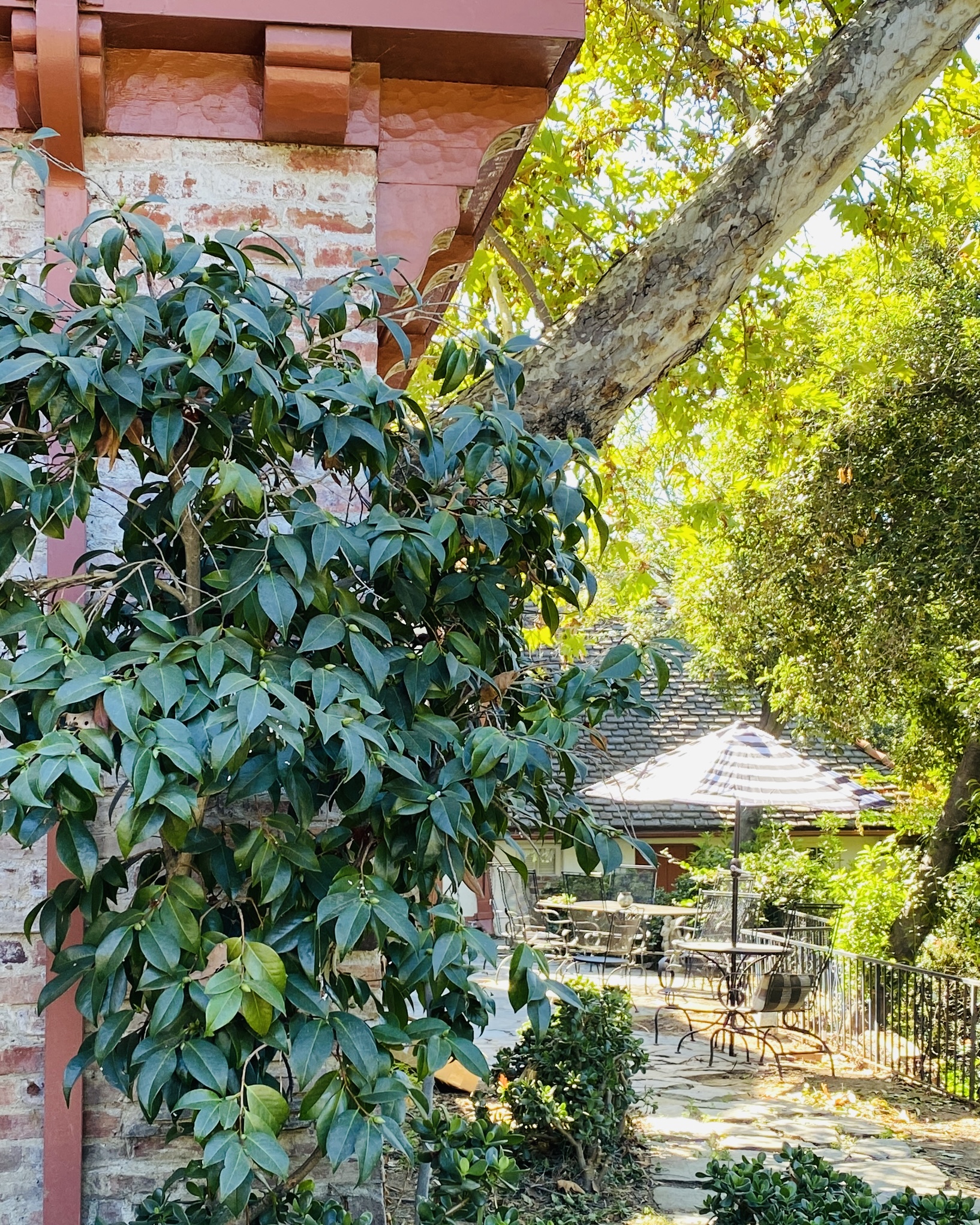 Not only is the roof still over our heads, many of the camellias in the photo will soon bloom; and, see the little sycamore tree halfway down the stone path? It continues to grow westward…